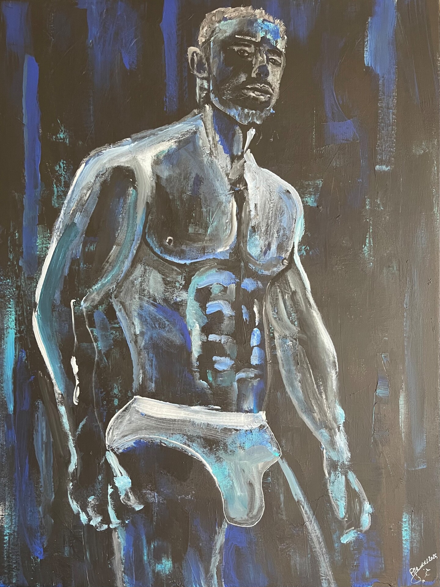 Dans cette toile, Gerard Menvussa capture l'essence d'une solitude moderne, celle d'un homme qui, las des illusions romantiques, se tourne vers l'éphémère pour combler un vide. « Scruff », titre évocateur d'une application de rencontre, devient ici le symbole d'une quête où les corps se croisent sans que les âmes ne se rencontrent vraiment.